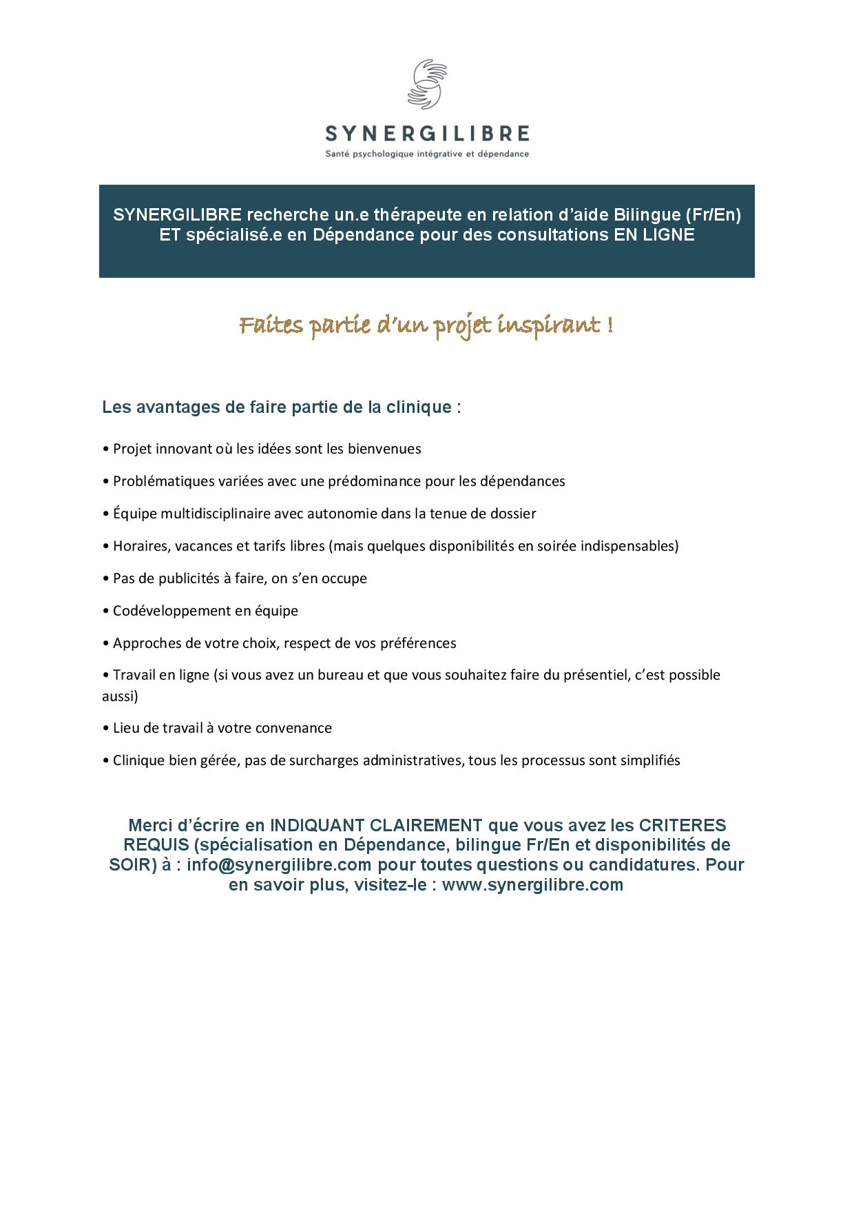 Thérapeute en relation d'aide (bilingue) recherché(e) spécialisé(e) en dépendance