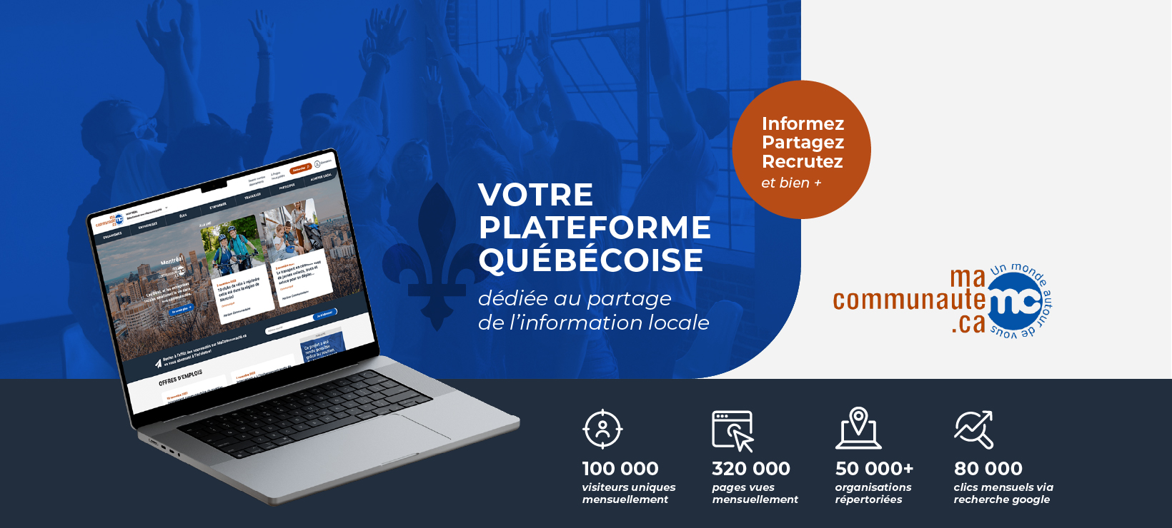 Chaque mois, plus de 100 000 visiteurs uniques consultent MaCommunaute.ca, permettant à nos membres de bénéficier d’une visibilité accrue auprès des citoyens de leur région, mais aussi à l’échelle provinciale.