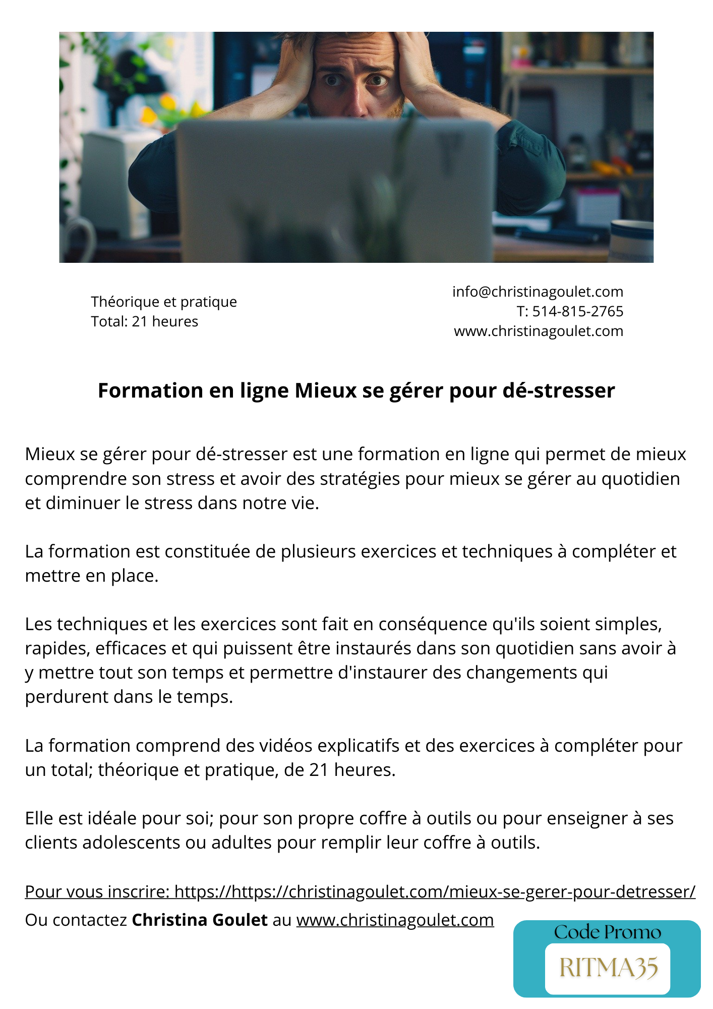 Mieux se gérer pour déstresser (21heures): https://christinagoulet.com/mieux-se-gerer-pour-detresser/